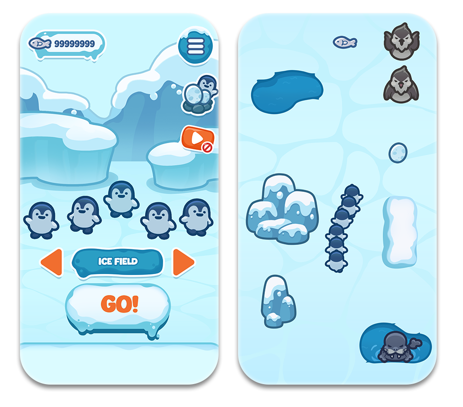 The player controls baby penguins dodging obstacles and collecting fish along icy platforms.